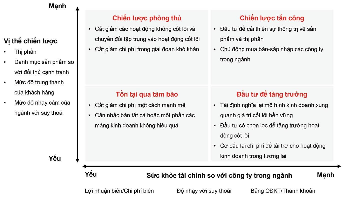 Để thích ứng, chiến lược của doanh nghiệp trong giai đoạn suy thoái cần dựa trên cả vị thế kinh doanh của doanh nghiệp trong ngành lẫn sức khỏe tài chính của mình. Đối với những doanh nghiệp yếu cả vị thế kinh doanh lẫn tài chính, việc cắt giảm chi phí một cách mạnh mẽ, cân nhắc thu hẹp kinh doanh hoặc bán những mảng kinh doanh yếu là điều bắt buộc.