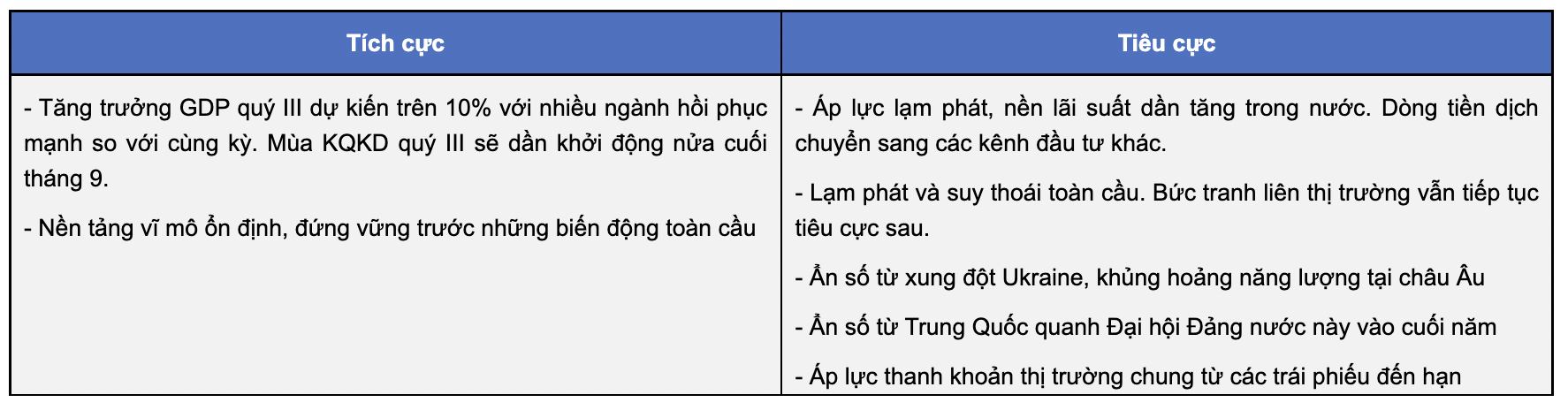Xét về thanh khoản, tầm nhìn 1-2 tháng tới, ông Đạt cho rằng sẽ không có nhiều thông tin và yếu tố có thể hỗ trợ kích hoạt dòng tiền trở lại trở lại thị trường chứng khoán ngoài mùa kết quả kinh doanh quý 3. Dự kiến với mức nền kết quả thấp của quý 3/2021, các doanh nghiệp sẽ có quý ghi nhận mức tăng trưởng mạnh nhất trong nhiều năm.