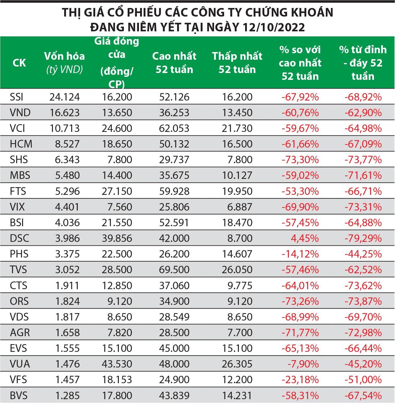 Nếu so với vùng đỉnh, nhiều mã mất 60 - 80% giá trị (xem bảng thống kê), mức giảm này thậm chí còn lớn hơn mức suy giảm khi thị trường tạo đáy giai đoạn đại dịch Covid-19 mới bùng phát. Theo Công ty Chứng khoán Agribank (Agriseco), nhóm cổ phiếu chứng khoán có độ biến động (beta) rất cao và gắn liền với diễn biến thị trường chứng khoán, vì diễn biến thị trường ảnh hưởng trực tiếp tới hoạt động kinh doanh trong kỳ. Thị trường chứng khoán giai đoạn vừa qua giảm mạnh cả về thanh khoản và điểm số nên thị giá nhóm này giảm sâu là phù hợp logic.