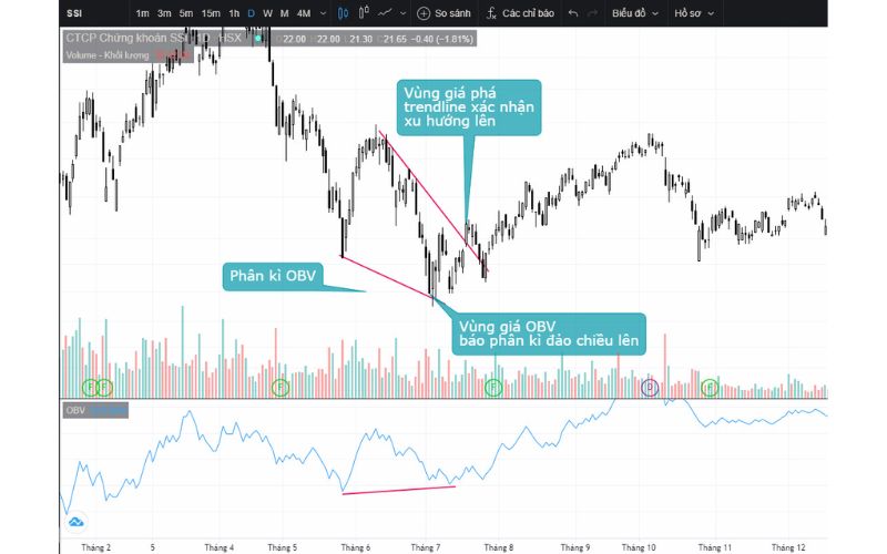 Biểu đồ trên là của cổ phiếu SSI. Pha tăng của cổ phiếu SSI đã bắt đầu từ ngày 06/07/2018, đây cũng là vùng mà chỉ báo OBV báo phân kì. Tuy nhiên phải đến ngày 18/7/2018 thì giá mới phá trendline để xác nhận xu hướng tăng. Tín hiệu phân kì là một tín hiệu khá sớm của chỉ báo OBV và nó có thể giúp cho nhà giao dịch có những vị thế tốt hơn.