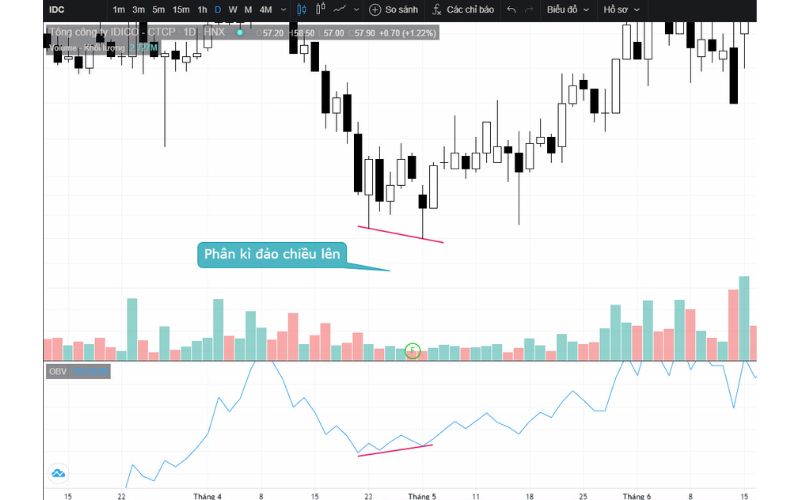 Các tín hiệu phân kỳ tăng và giảm có thể được sử dụng để dự đoán sự đảo ngược xu hướng. Những tín hiệu này thực sự dựa trên lý thuyết rằng khối lượng đi trước giá. Sự phân kỳ tăng giá hình thành khi OBV tăng cao hơn hoặc hình thành mức thấp hơn ngay cả khi giá di chuyển thấp hơn hoặc tạo ra mức thấp thấp hơn.