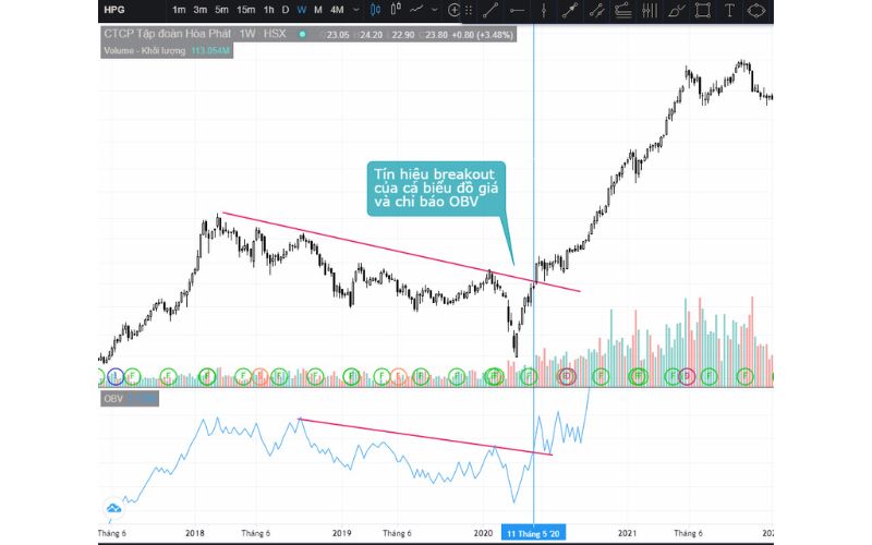 Biểu đồ của HPG với chỉ báo OBV. Ta có thể thấy khi giá của HPG phá vỡ đường trendline vào giữa tháng 5, 2020; đồng thời đường OBV cũng có một tín hiệu breakout tương tự. Điều này củng cố thêm cho độ chính xác của tín hiệu và xác nhận xu hướng tăng đã trở lại.